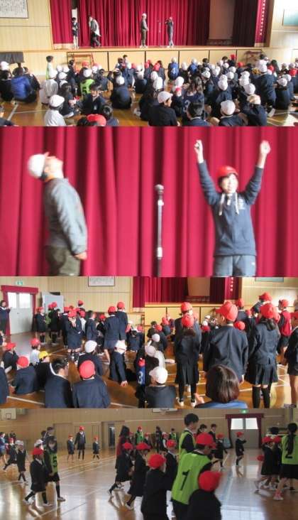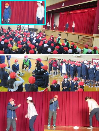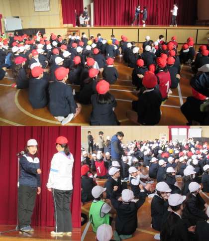 今日の児童集会のゲーム名です。2人の先生が赤白帽をかぶり、「あっち向いてホイ!」で対戦。たて割り班で相談して、勝つと予想した色の帽子を被ります。