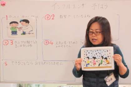 この時期、風邪やインフルエンザが流行しやすいので、渡邉先生が保健指導をしてくださっています。予防のためにも、「早寝・早起き・朝ごはん」「手洗い・うがい・換気」心がけましょう!