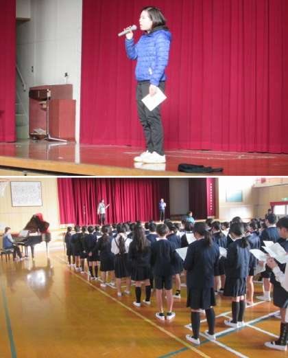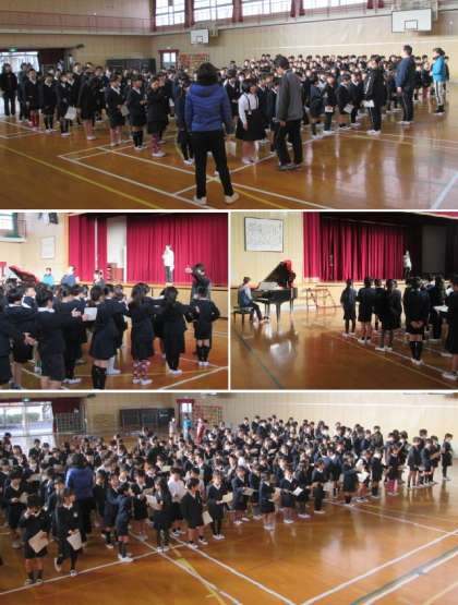今回の「歌手」は松岡先生。美声を子どもたちに届けてくれました。最後は1〜3年生と4・5年生とで合唱です。みんなのハーモニーに、聞きほれるほどでした。