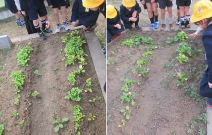 2年生は、朝会終わりに花壇へ。少しずつ大きくなってきましたね!