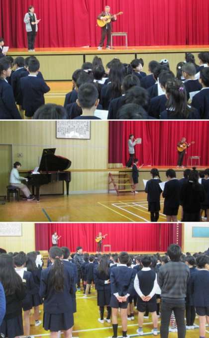 今年度の音楽集会は最後ということで、なんと「歌手」は校長先生です。ギターと片岡先生のピアノのコラボで、子どもたちと一緒に大合唱!