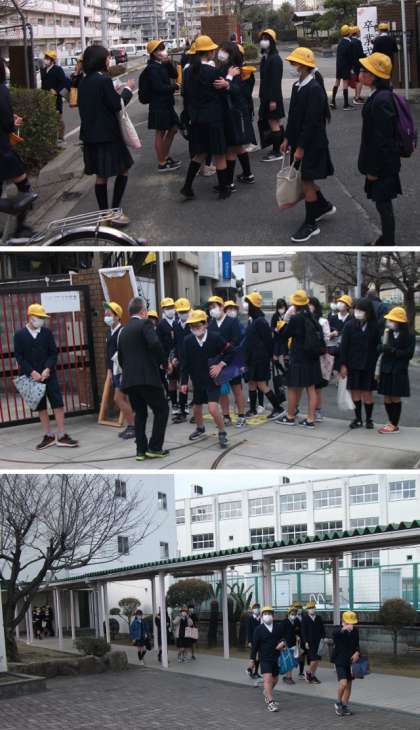 3月18日、穏やかな陽気の中、卒業生が登校してきました。もちろん卒業の喜びもあるのでしょうが、約3週間ぶりに顔を合わせたこともあってか、みんな嬉しそうです。校長先生の朝の出迎えも久しぶりです。
