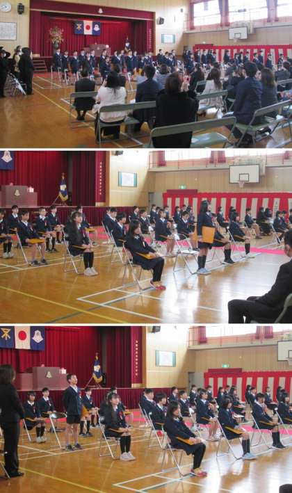 今年は座席から、自分の発表と歌の時だけ立ち上がります。喜びの言葉、♪校歌、♪旅立ちの日に、どれも練習をしていないと思えないほど、気持ちが伝わってきました。