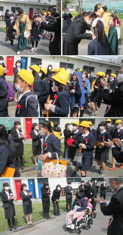 教室で一時を過ごした後、多くの方々で作られた花道を通って学校を旅立ちます。どの子も充実した笑顔です。