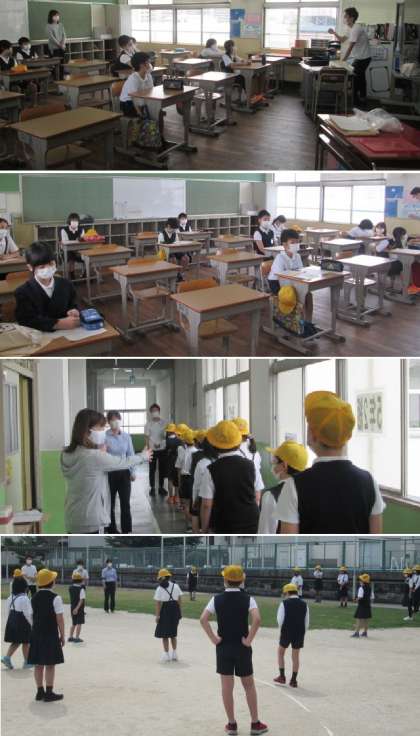 運動場に出て、1・2組の担任と顔合わせ。その後、ソーシャルディスタンスをとった鬼ごっこ!みんなでの活動はとても楽しそうです。