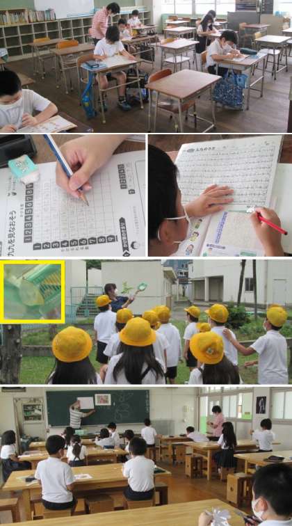 3年生は、プリントや教科書の問題に挑戦。休憩時間には、育てていた幼虫がモンシロチョウになったので放してあげました。図画工作科「ふしぎな花」作りも、行いました。
