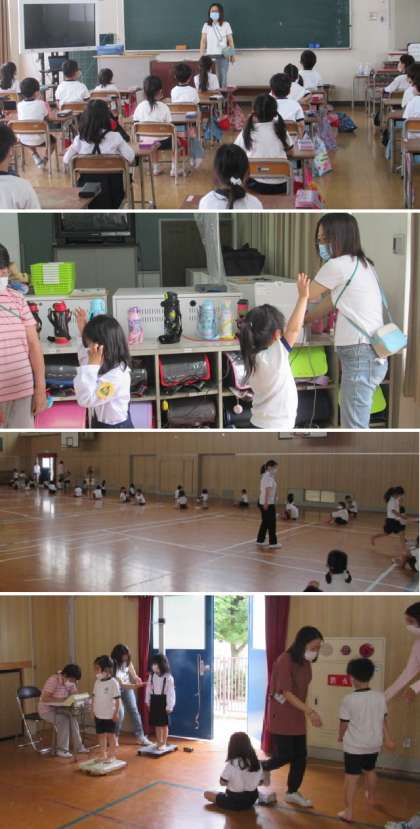 1年生は、初めての健診です。渡邉裕子先生のお話を聞いた後、教室で聴力検査を、体育館で発育測定と視力検査をしました。緊張気味でしたが、無事終わりました!