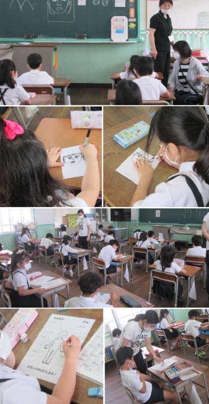 2年生は、自分の顔を描いたり、自己紹介カードを作ったりしました。輪郭を描いたり色塗りしたり、とても集中して取り組みました。