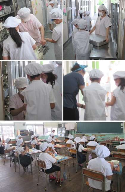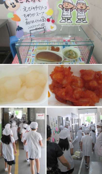 3か月半ぶりの通常給食です。今日のメニューは「パン、牛乳、えびのチリソース、中華スープ、和なし(カット缶)」です。おかずが増えたので、給食当番も人数が必要。調理員さんも、子どもたちにしっかりと手渡ししてくださいました。教室では、静かに、美味しくいただきました。