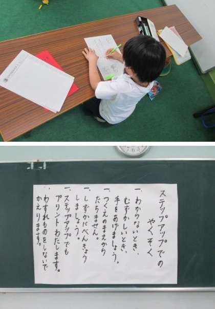1年生の様子を紹介します。1年生は、今日で2回目。ちゃんと間をあけて、座っています。ひらがなの練習をしたり、算数をしたり、自分で考えたり担当の先生に教えてもらったり。ステップアップのやくそくを守り、自分の課題に取り組んでいました。