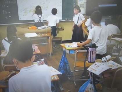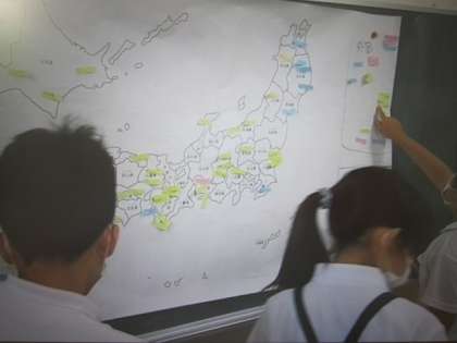 調べ方を学んだ後は、さすがデジタルネイティブ。すぐに近くのお店のチラシを見比べ、どこが安いか・・・ではなく、〇〇はどこから来ているかをたくさん調べ、黒板の白地図で共有しました。分析はまた後日。