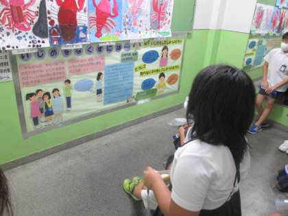 普段は忙しく校舎内を行き来しているためか、目にはついてもなかなか立ち止まって見る機会が持てないので、子どもたちは「こんなことが書いてあったんだ。」と感心していました。