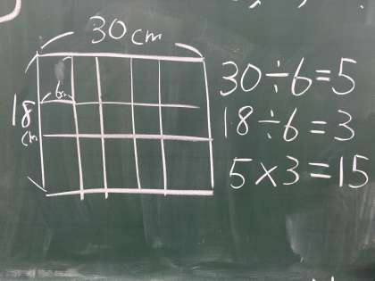 今回一番難しかった「縦18cm横30cmの長方形を正方形で敷き詰めたとき、一番大きな正方形は、全部で何枚いるでしょう。」という問題。授業では、18と30の公約数を求めて、一番大きな正方形の1辺は6cmと求める。次に、その正方形は縦に18cm÷6cmで3段、横に30cm÷6cmで5列並べることができるので、3×5で15枚と考えました。