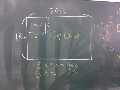 その児童は18cm×30cm長方形の面積(540㎠)を求めたあと、正方形の面積(36㎠)でわるといいという考えでした。答えはもちろん15枚「なるほど」と大正解で、拍手喝采に包まれました。