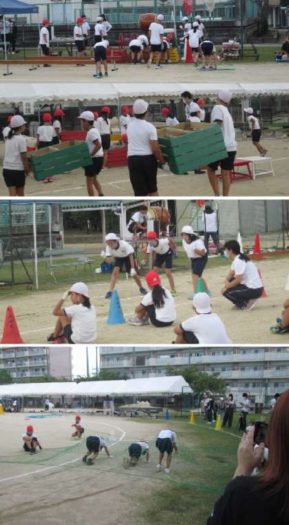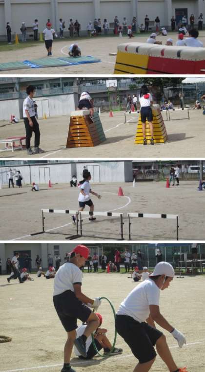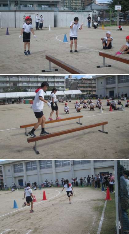 5年の個人走。3年生より距離が長く、跳び箱が高くなり網くぐりも増えました。準備も自分たちで。増えた野や山を、1つ1つ越えていきました。