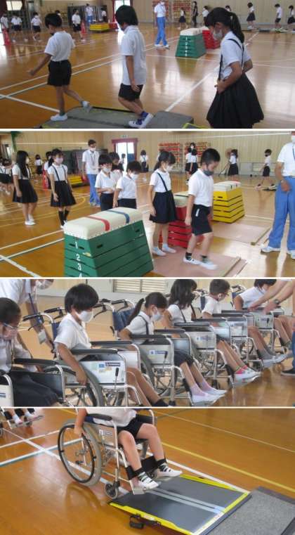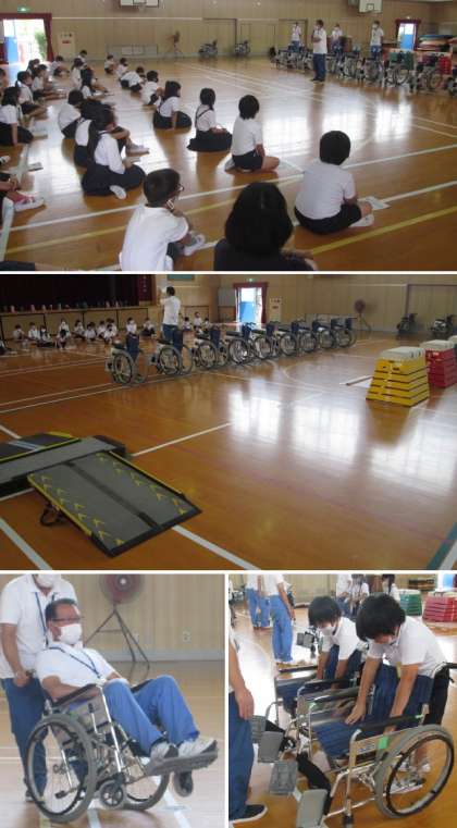 3年生は、9月30日(水)大阪市立リハビリテーションセンターの方にお越しいただき、車いす体験をしました。初めに車いすの説明を聞き、実際に開閉しました。次に障害物のあるコースを実際に歩いた後、車いすの自走体験をしました。自分で歩いたときは大丈夫でも、車いすなら少しの坂でも段差でも動かすのにとても大変なことが実感できました。