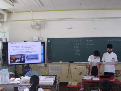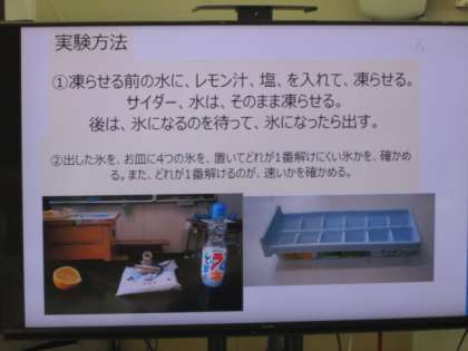 「自由研究」先週からの続き、その3です。「早く溶ける氷はどれか」「外来種の魚について」を発表しています。