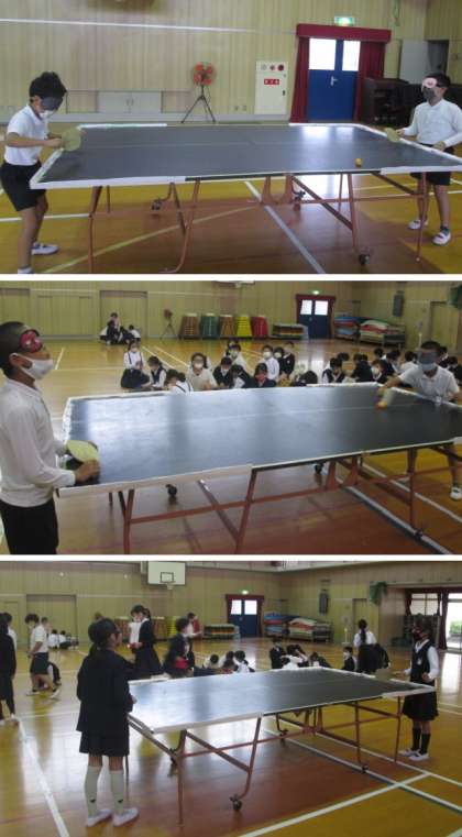 3時間目、4年生は昨年に続いて2度目です。講堂で、実際に卓球をしていただきました。自分たちもアイマスクをして体験して難しさがわかったことで、山本さんのすごさを昨年度以上に感じました。