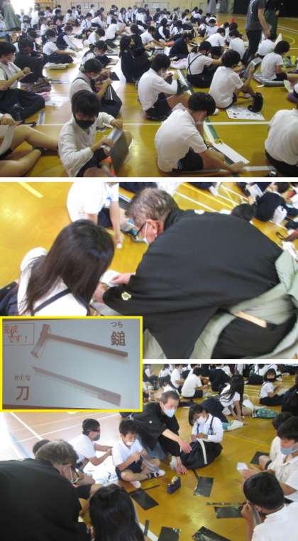 第1部は、狂言と能の解説と道具作りのワークショップです。スクリーン等も用いながら、分かりやすく解説してくださいました。