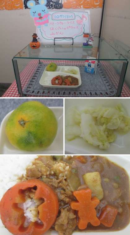 今日のメニューは「ポークカレーライス、はくさいのピクルス、みかん、牛乳」です。今日もカレーのルーが米粉、小麦アレルギーの人も食せます。