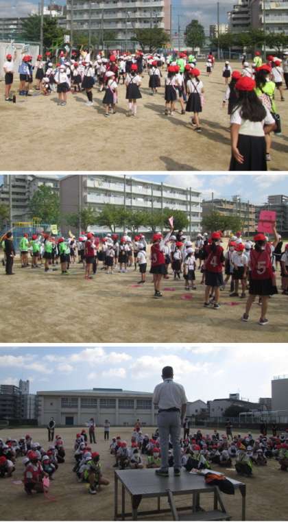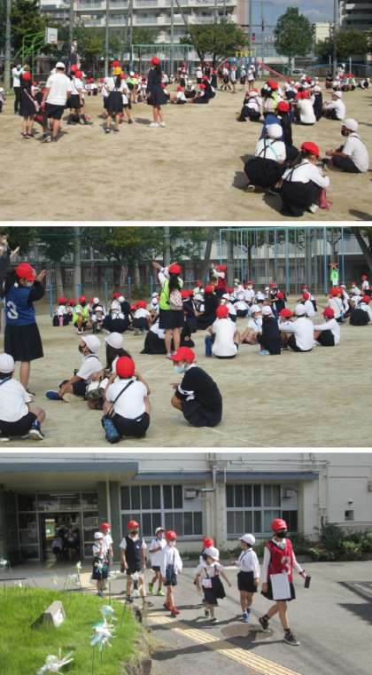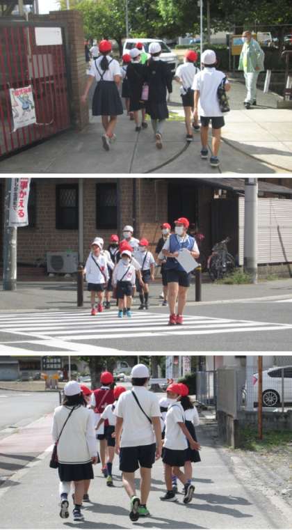 班長が1年生を迎えに行き、運動場に整列します。校長先生と朝のあいさつの後、「今日のキーワードはたった1つ、『安全』です。安全に気をつけるように」というお話を聞き、いよいよ本番へ。吉田晃大先生からのクイズに正解した班から、順にスタートしていきました。