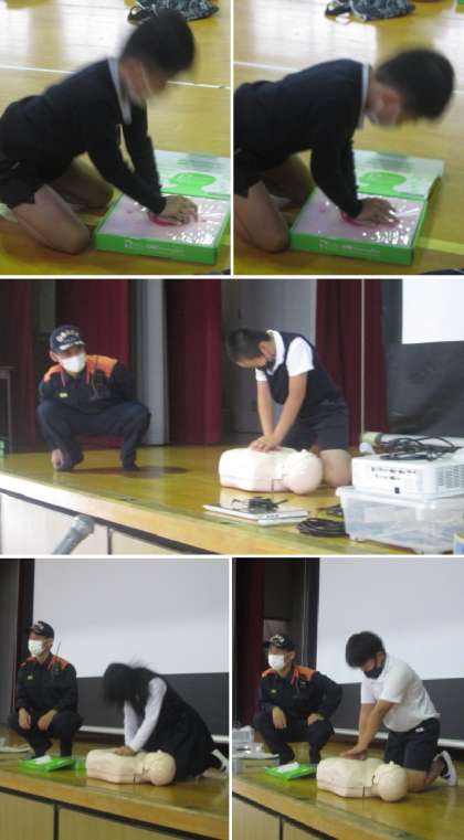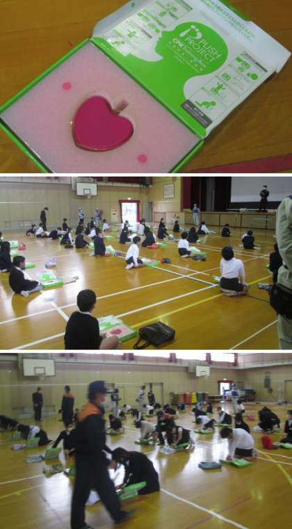 心臓マッサージの練習用に「あっぱくん」をたくさん持ってきてくださったので、一人ひとりしっかりと取り組みました。