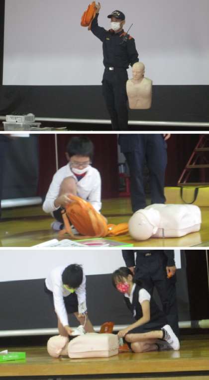 4〜6年生は、心臓マッサージや水消火器の放水体験、応急処置の仕方について学習しました。