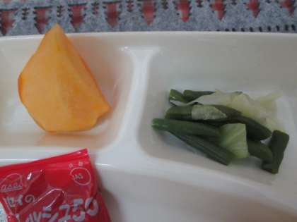 今日の給食のメニューは「コーンクリームシチュー、キャベツとさんど豆のサラダ、柿、パン、牛乳」です。