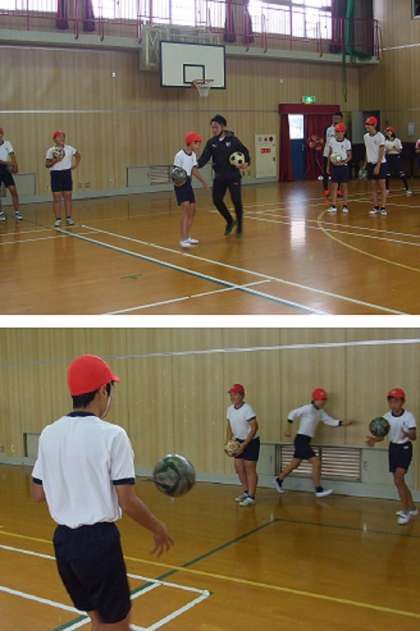 最初は、個人練習です。手で扱ったり、友だちと取り合うゲームやロングパスなど行ったり、楽しくボールと触れ合うことができました。