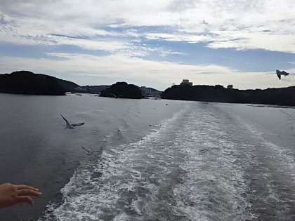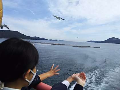 船の甲板では、カモメが出迎えてくれました。とんびも合流、賑やかです!