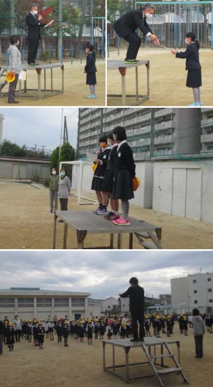 学年ごとに出てきて、全員がそろったところでいつもより間を広く取って整列をしました。1年生にとっては、小学校生活初めての運動場での朝会。少し緊張の面持ちでしたが、ちゃんと話を聞くことができました。