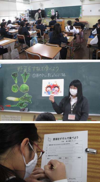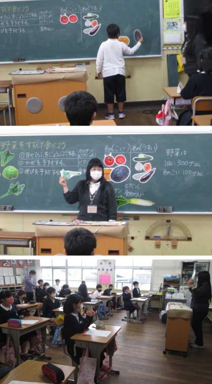 「野菜を食べたら3つの良いことがあるよ!」野菜の持つ3つの働きを、本物そっくりな掲示物等を用いて、分かりやすく説明してくださいました。