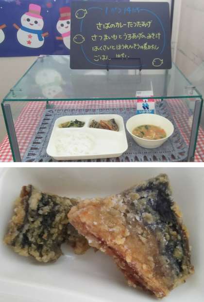 今日の給食は「さばのカレーたつたあげ、さつまいもとうすあげのみそ汁、はくさいとほうれんそうの煮びたし、ごはん、牛乳」です。