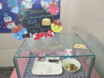 今日のメニューは「いわしのしょうがじょうゆがけ、含め煮、いり大豆、ごはん、牛乳」です。
