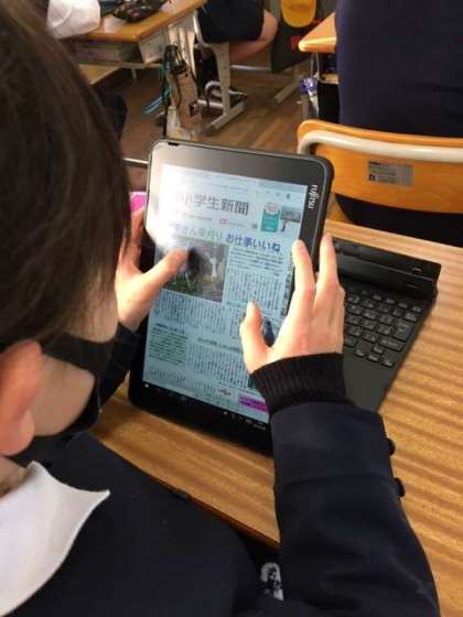 写真は今朝のものです。朝の用意ができた児童から、今朝の「心の天気」を入力し、キーボードを取り外してデジタル新聞を読んでいました。
