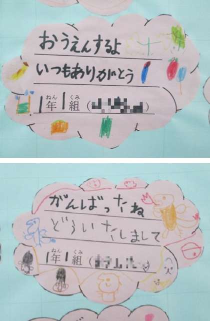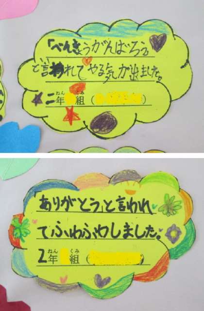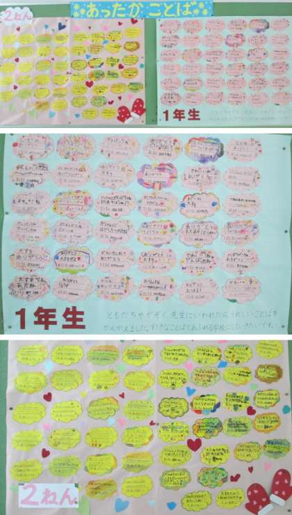 「あったかことば」1年生は、言われてうれしい言葉を考えて。2年生は、実際に言われた言葉とその時の気持ちを。どの作品も、読むだけで心がポカポカとなってきます。