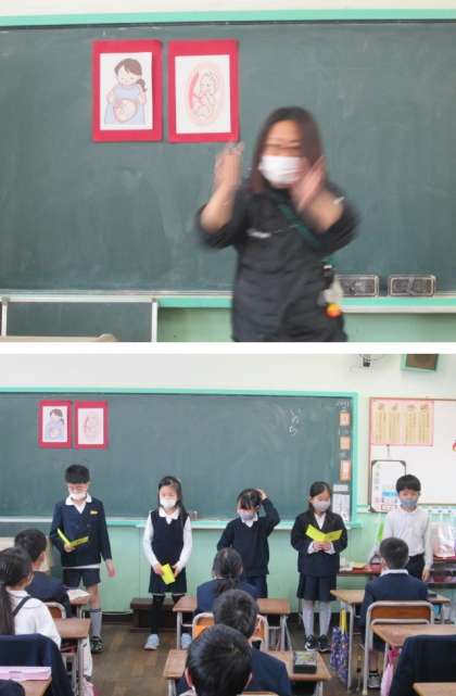 2年生の生活科「できるようになったこと」で、自分の成長を振り返っています。その一環として、おなかの中の成長も振り返るということで、保健室の渡邉裕子先生に授業をしてもらいました。みんな、真剣に取り組んでいました。