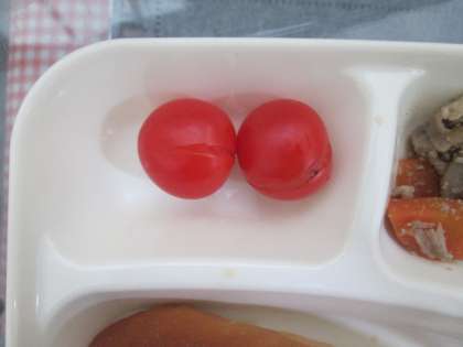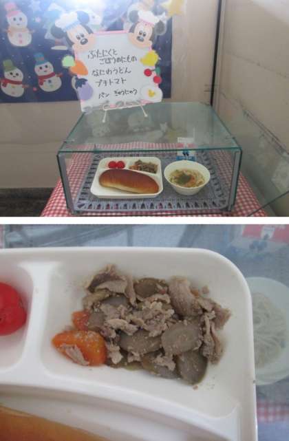 今日のメニューは「豚肉とごぼうの煮もの、なにわうどん、プチトマト、パン、牛乳」です。