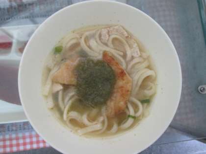 「なにわうどん」は「きつねうどん」をイメージしたもので、三角に切って甘辛く煮た薄揚げと、かまぼこ、青ネギが入ったうどんに「とろろこんぶ」を入れて食べます。「きつねうどん」が大阪で生まれたと言われていること、「とろろこんぶ」も大阪で昔から作られていることから、大阪市の給食では「なにわうどん」と名付けられました。