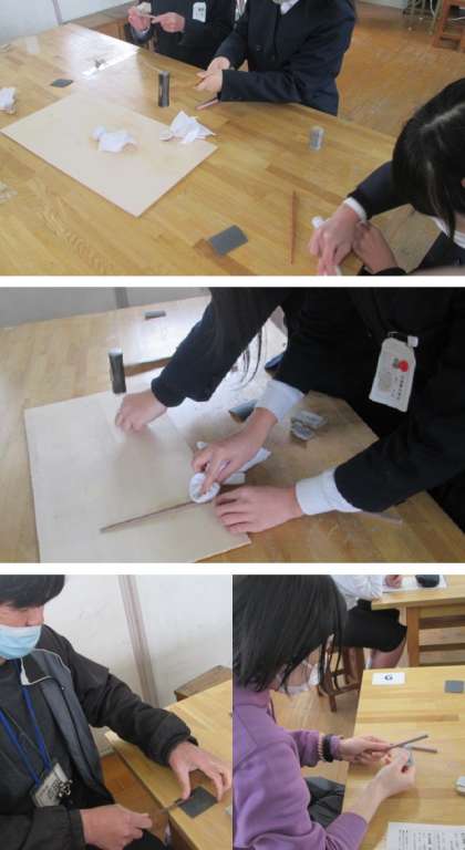 箸の保護に使うオイルも、くるみを何度もたたいて自ら作り出します。しみ出てきたオイルを塗りこみ、それから仕上げの磨きです。担任の先生も、一緒にトライ!