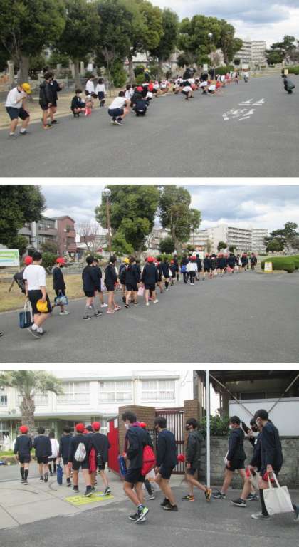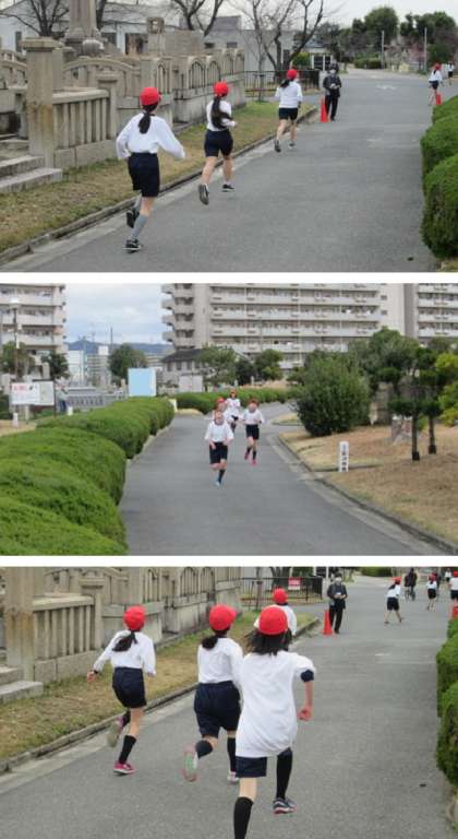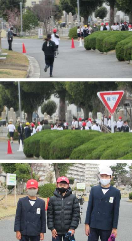 他の人も、どんどんゴールしていきます。最後の人がゴール、みんなで迎えました。トップ3の記念撮影。整理運動を終えて学校へ帰る時、ちょっとくたびれた様子が。それだけ、参加者一人ひとり、力を発揮したということですね。本当に、よく頑張りました!