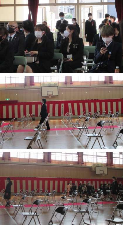 卒業生一人につき長椅子一脚という制限がありましたが、多くの保護者の方々が参加してくださいました。いよいよ開式です。いつもより少し緊張の面持ちですが、立派に入場です。