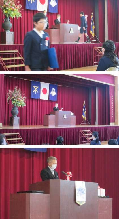 校長先生の式辞「五つの誓い」「当たり前のことができるありがたさを胸に、日々精一杯生きていってほしい」真剣に聴き入っていました。