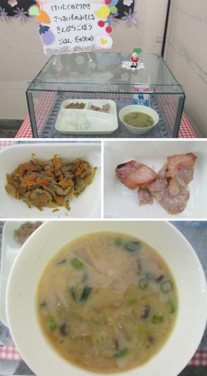 今日のメニューは「鶏肉のてり焼き、さつまいものみそ汁、きんぴらごぼう、ごはん、牛乳」です。