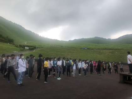 「校長先生の話」の後、「ラジオ体操」をして、高原の空気を体いっぱいに吸い込みました。