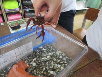 待ちに待ったザリガニに、子どもたちは大喜び。「こわーい」「はさみがすごーい」と最初はこわごわだった子どもたちも、すぐ慣れてきてつかめるようになってきました。休み時間は、ザリガニ観察で大盛り上がりの1日でした。