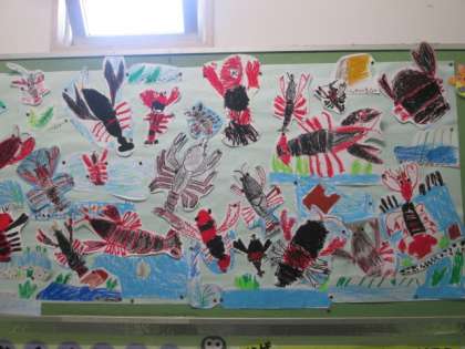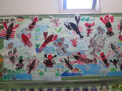 ザリガニの絵を描き、階段のところに掲示しました。とても、力強いザリガニです。ザリガニの名前を、グループごとに決めました。「カイくん」「コアラ」「まる」「ザリちゃん」「なっちゃん」「れん」「かける」「あおいちゃん」ザリガニらしからぬユニークな名前ばかりです。