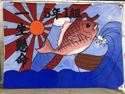 クラスごとにデザインして描いた大漁旗は、大きく風になびいていました。