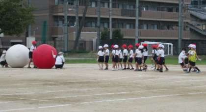 ・・・2人1組で大玉を転がします。コーナーワークがポイントです。