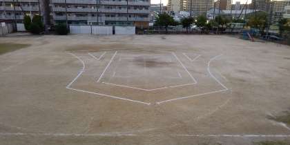 今日、午後に撮影のスタッフの方が、運動場いっぱいに瓜破東小学校の「校章」を白線で描きました。